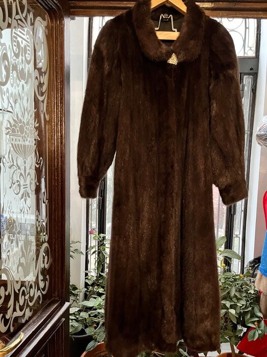 Schitterende lange nertsjas, zwarte kleur, gemaakt door het beroemde Duitse bedrijf Saga Mink. De mouwen zijn groot en rijk, 64 cm lang