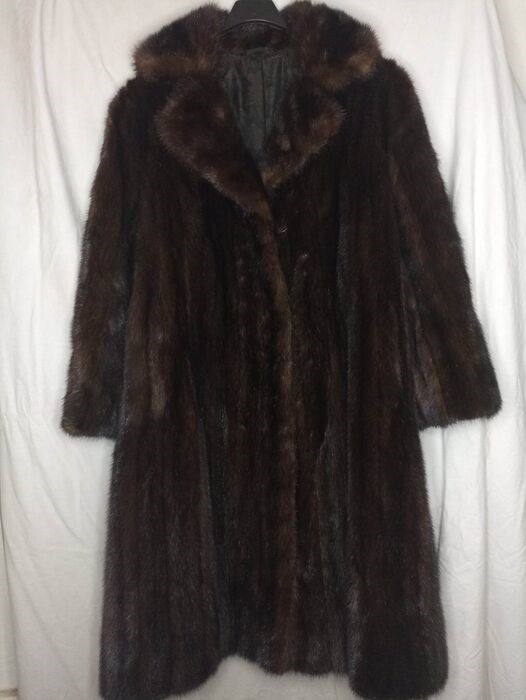 Donkerbruin bont, met gedecoreerde binnenkant. Metalen knopen met ring- en kliksluiting