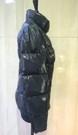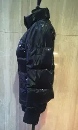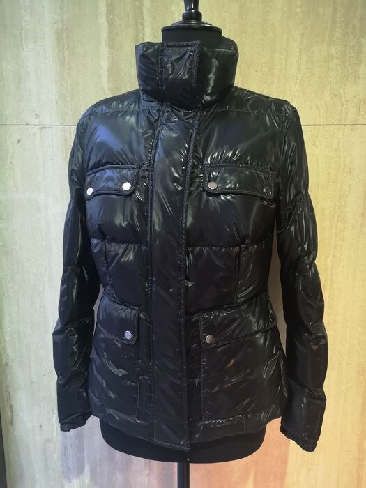 Donsjack van glanzende zwarte waterdichte stof, met dubbele ritssluiting en drukknopen.
