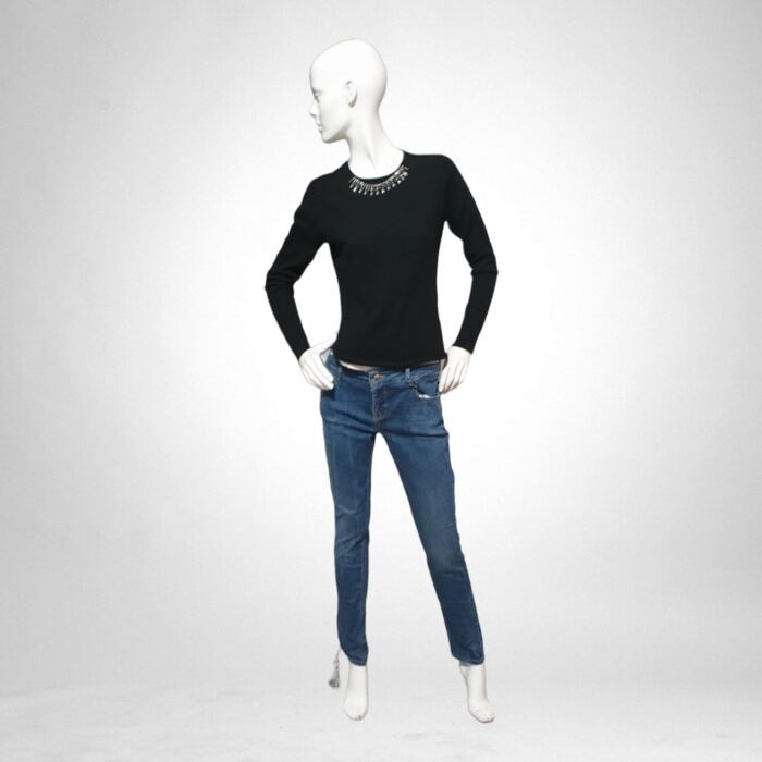 Mooie Blumarine trui, zwart, met ronde hals versierd met een grote halsketting in edelstenen.