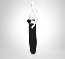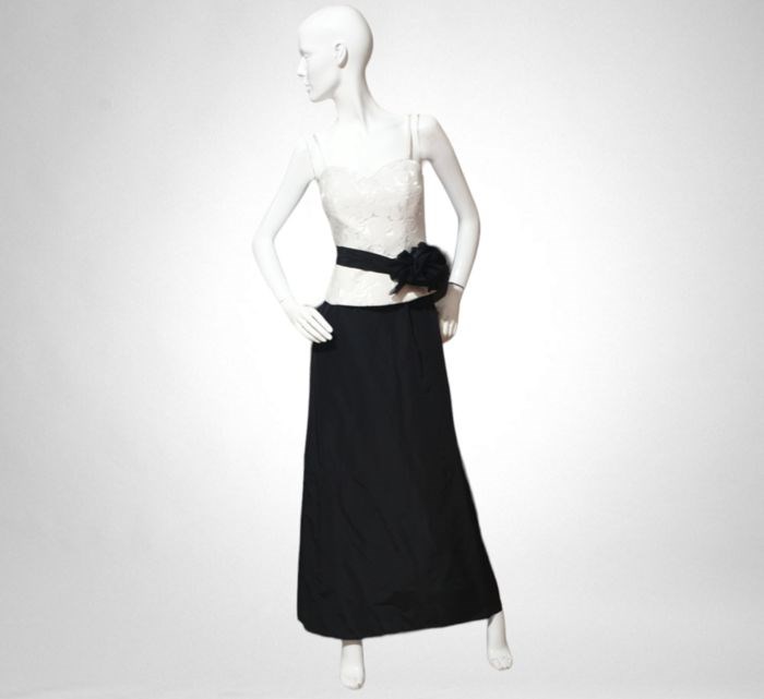 De jurk wordt aan de achterkant gesloten door een lange ritssluiting terwijl de taille van de jurk wordt gemarkeerd door een zwarte riem die eindigt met een grote roos.