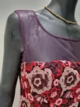 Bijzondere en unieke BLUMARINE-jurk maat XX gekenmerkt door een geperforeerd gaas op de halslijn en schouders dat wordt herhaald aan de onderkant door de hoofdstof af te wisselen.