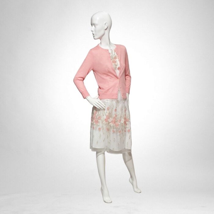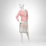 Elegante cocktailset met een zachte lijn bestaande uit een wijde rok in organza geborduurd met bloemmotieven in roze en goudtinten, afgestemd op de transparante bovenkant en aangevuld met het verfijnde roze kasjmier vest.