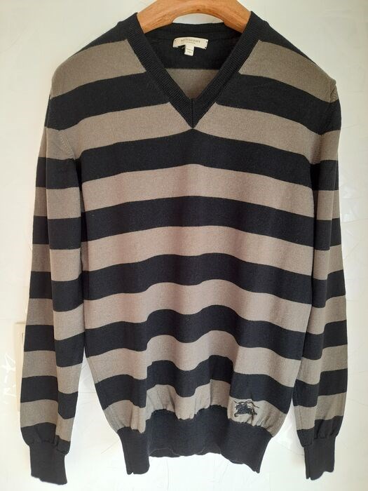 Burberry trui, V-hals, zwart en donkergroenachtig beige8 strepen. 100% merinowol van de beste kwaliteit. Zeer warm, comfortabel en tijdloos, passend bij verschillende stijlen.