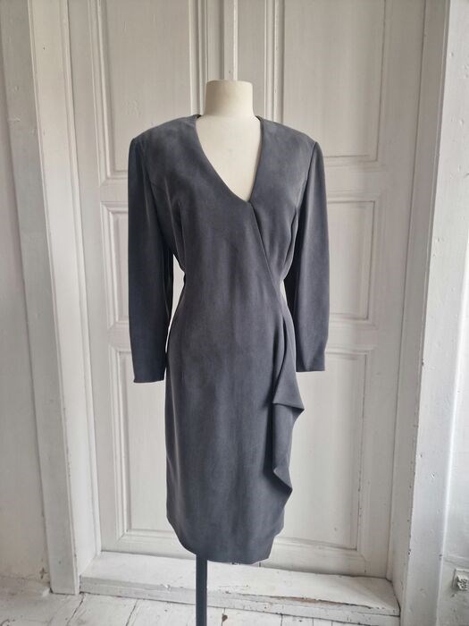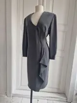 Kokerjurk met een asymmetrische V-hals en een ruche voor. Kleine schoudervullingen en een ritssluiting aan de achterkant.