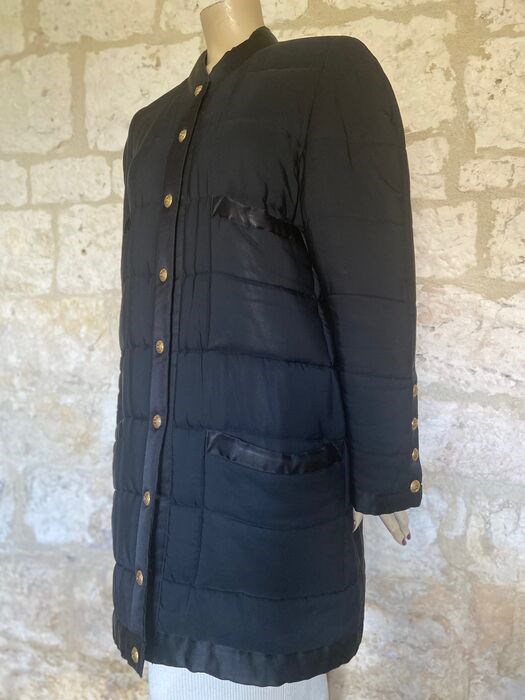 This amazing silk quilted coat features long sleeves, rounded neckline, gold plated metal “CC” press stud buttons front down closure, four matching buttons on each sleeve cuff and one of each front slit pocket and is fully lined in black silk.