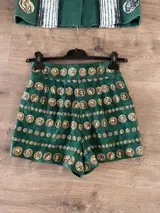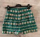 Short met bandjes, gemaakt in Italië van stof met een reliëfpatroon gemarkeerd met gouden munten.