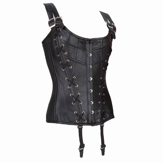 Echt zwart leren corset met stalen busk en buigzame baleinen voor een strakke pasvorm, haakjessluiting aan de voorkant en stevige lange rijgveter aan de achterkant. Kan aan de bovenkant op maat worden gesteld.