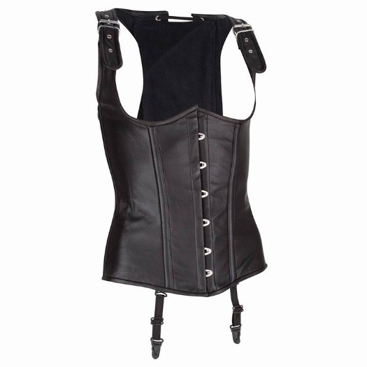 Echt leren underbust corset op hoogte verstelbaar met stevige buigzame baleinen voor een strakke pasvorm, haakjessluiting aan de voorkant en stevige lange rijgveter aan de achterkant.
