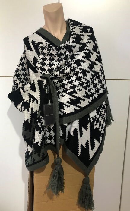 Prachtige, zeer omhullende cape, nooit gedragen, nog steeds met EMPORIO ARMANI-tag, pied de poule-motief in wit, zwart en grijs, de hoeken eindigen met 4 strikken, verzending met tracking