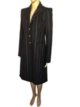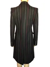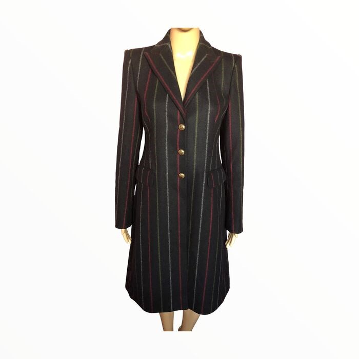 Schitterende en zeldzame Emporio Armani jas in zwarte wol met bordeauxrode, groene en grijze strepen in nieuwstaat. Zeer originele goudkleurige metalen knopen gesigneerd door het merklogo. De schoudervullingen geven het een sublieme vorm bij de schouders.