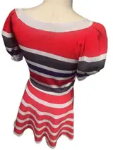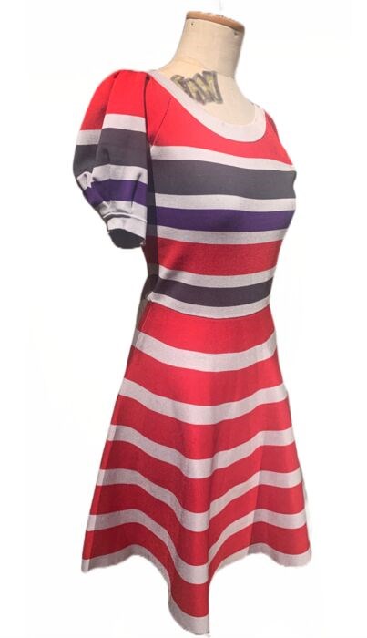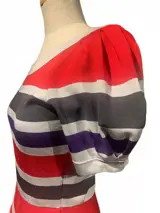 Verschillende maten en verschillende kleuren (paars, rood, donkergrijs en zilver) strepen op deze a-lijn jurk van Emporio Armani.
