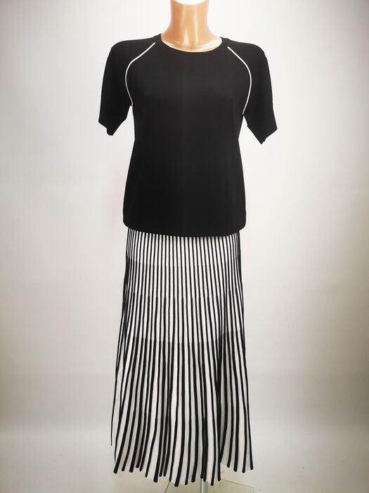 Gebreid tweedelig pak bestaande uit plooirok en trui: