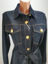 met strikceintuur en grote, goudkleurige knopen