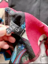 Zeer mooie en originele ETRO-jurk in lichte wol in rode, veelkleurige geometrieën op een grijze achtergrond met details in het typische paisley-patroon dat het merk historisch kenmerkt.