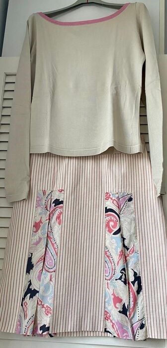 Bijpassende top: dunne, lichtbeige zijden trui met wijde halslijn en gekleurde bies passend bij de rok, volgens het label, Italiaanse maat 42. De maat van de rok en trui passen perfect bij elkaar.