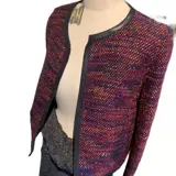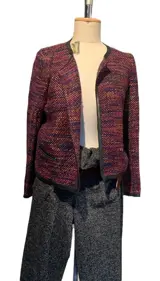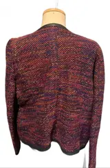 Veelkleurig open jasje/vest van George Rech. Klein zwart leren biesje. Dezelfde afwerking op valse zakken.