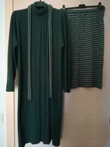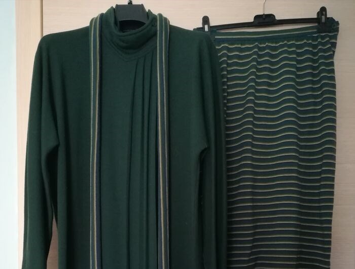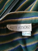 Gianni Versace, voor deze 2-delige outfit, bestaande uit een groen, beige en blauw gestreepte kokerrok, en een flessengroen vest. Het knoopt aan de hals met 3 knopen, aanwezig op een plooi die het onderscheidt door zijn originele afwerking.Geleverd met een riem in dezelfde stof (zie foto) en kleuren. Daterend uit de jaren 80.