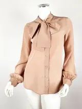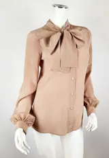 Klassevol en tijdloos is deze beige, zijde blouse met een licht gouden schakering.