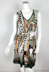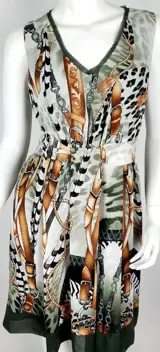 Schitterend en zwierig is deze meerkleurige jurk met een hippische print van koorden, kettingen en riemen.