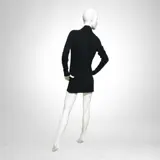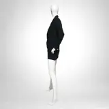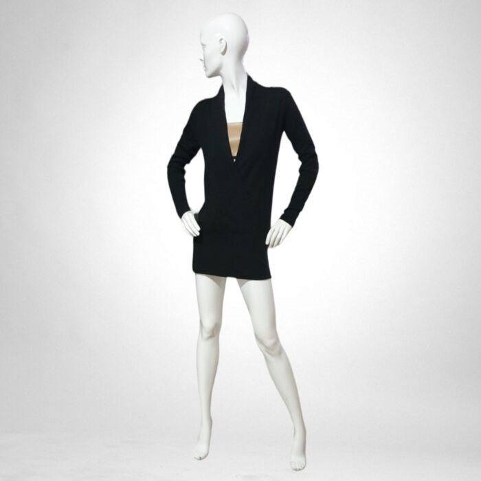 Zeer bijzondere jurk van 100% kasjmier, zwart, met een bijzondere V-hals die uitloopt in een strakke minirok.