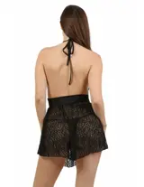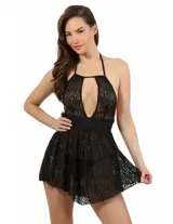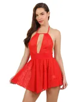 Deze kanten jurk laat een stijl zien die zowel gedurfd als elegant is. De diepe V-halslijn en open rug geven een sensuele touch, terwijl de uitlopende snit een licht en vrouwelijk effect geeft. Het delicate kant omsluit de silhouet voor een romantische uitstraling, terwijl de taille wordt gemarkeerd door een satijnen band om de silhouet te benadrukken. Perfect voor een speciale avond of een chique uitje, deze jurk zal zeker de aandacht trekken.