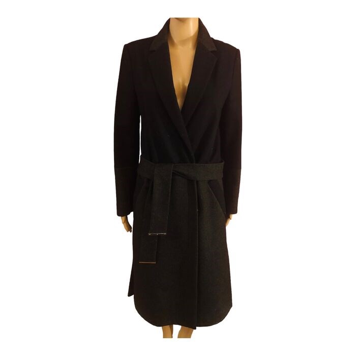 Prachtige jas van Karl Lagerfield in zwarte en kaki wol met bijpassende riem. In uitstekende staat, nauwelijks gedragen. Twee voorzakken. Sluiting met drukknopen. De metallic afwerkingen van de riem zijn gesigneerd door Karl Lagerfield.