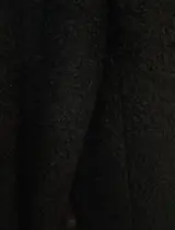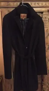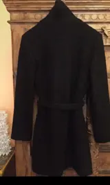 Knielengte met zwarte bouclé riem, past perfect bij maat 40.