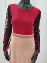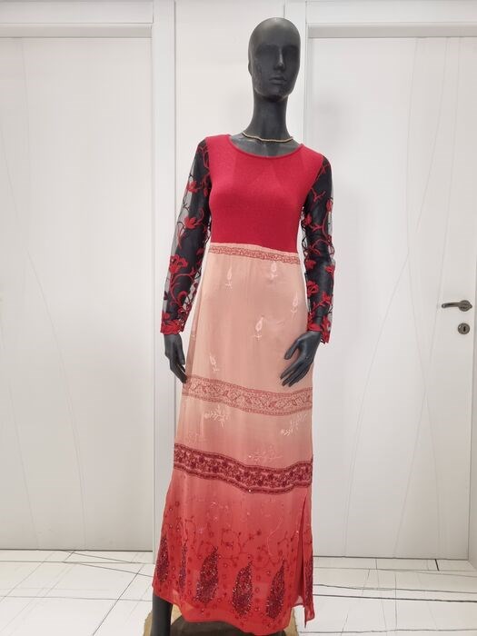 Bijzondere en elegante LA PERLA jurk maat 44 in een vakkundige combinatie van kleuren (zwart, rood en roze) en de toevoeging van borduursels en pailletten.