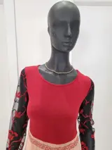 De keuze om de mouwen in te zetten in geperforeerd gaas met contrasterende rode bloemenborduursels op een zwarte achtergrond is heel bijzonder.
