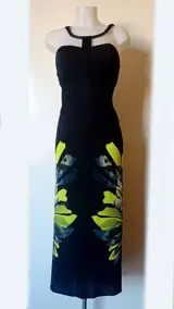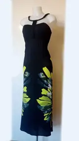 Mooie lange jurk, valt vooral op door de open rug en de sluiting rond de hals.