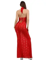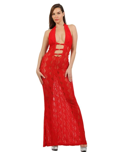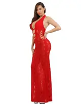 Accentueer je figuur met deze lange, rugloze kanten jurk, verkrijgbaar in wit, rood en zwart. De elegante snit met openwerk aan de voorkant en gekruiste veters aan de zijkanten accentueren je rondingen en geven een vleugje sensualiteit. De kanten stof, versierd met geometrische patronen, omhelst je lichaam subtiel en onthult precies de juiste hoeveelheid. De borst is bekleed om optimale ondersteuning en discreet comfort te garanderen. De open achterkant sluit met een mooie strik, wat een verleidelijke uitstraling toevoegt aan dit must-have stuk. Perfect voor een speciale avond of een glamoureuze gelegenheid, deze jurk is een waar eerbetoon aan vrouwelijkheid.