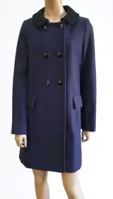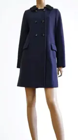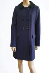 Het model heeft een double-breasted sluiting met knopen, een overhemdkraag in contrasterende kleur wol, lange mouwen met laag ingezette en opgestikte zakken met klep, een split op de rug.