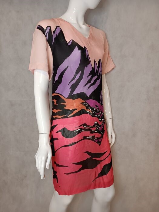 Als nieuw, merklabel ontbreekt, maar het oranje label met de maat en het samenstellingslabel is nog aanwezig. 100% zijde, semi-transparant, heeft voering nodig of kan over het badpak gedragen worden.