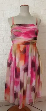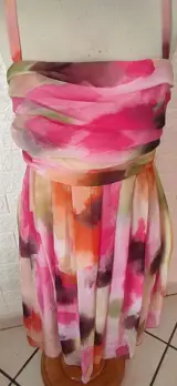 Moschino Cheapandchic jurk, in zijdemix met bijpassende stola. Bloemenpatroon, vloeiende en lichte stof, roze zuivere katoenen voering. Model met bretels, opening met onzichtbare ritssluiting aan de zijkant. Gedrapeerd aan de voor- en achterkant, los vallend met plooien. Maat 40 FR.