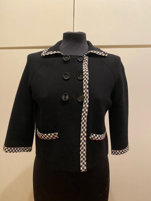 Kort double-breasted jasje van Moschino met motieven op de manchetten, zakken en kraag.Perfecte staat.
