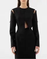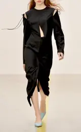 Gedeconstrueerde jurk met schouderuitsnijdingen en veters.