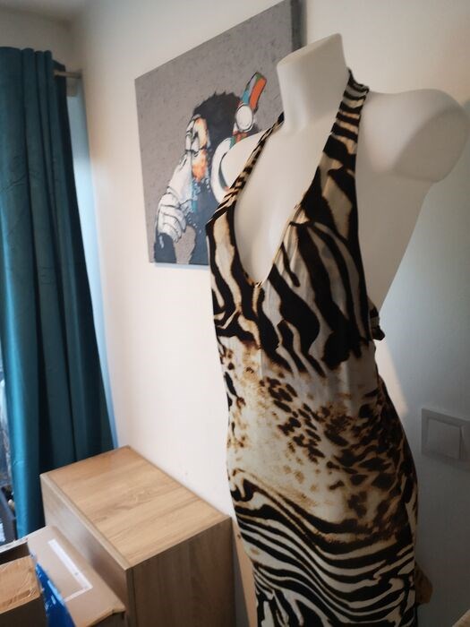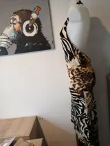 Zeer mooie avondjurk met zeer lichte blote rug, elastische stoffen geschikt voor een 38, 40,42,44 dierenpatroon