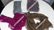Lange sjaal aan 1 zijde afgewerkt met kant/ andere zijde een roesje (dubbel stof rand).