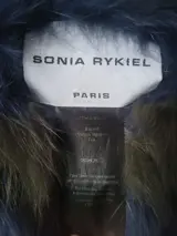 Sonya Rykiel gebreide damescape in donkerblauw, kaki groen, wit en corail kleurengamma.