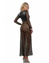 Durf er fel sexy uit te zien met deze lange jurk die de charme van wetlook combineert met de sensualiteit van een breed visnet. Het leren top sluit de buste aan met een nauwsluitende snit en een V-hals, geaccentueerd door een rits aan de voorkant, voor een gedurfde en zelfverzekerde uitstraling. De lange mouwen en de breed gebreide visnetrok spelen met transparantie, waardoor de silhouet subtiel wordt onthuld en de lijn verlengd. De voorste split benadrukt het glamoureuze effect van de outfit, perfect voor optredens, themafeestjes of om alle ogen te betoveren. Een sterk stuk, even prikkelend als elegant, om naar wens te versieren voor maximale impact.