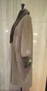 Camelkleurige jas van zuivere wol met kraag en manchetten van imitatiebont. Double-breasted crossover-sluiting, met vier knopen, twee zakken, manchetten met knopen.