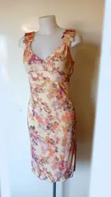Prachtige viscose jurk in een kleurrijk gemêleerd bloemenpatroon, met zijden satijnen bandjes en aan de binnenkant gevoerd.