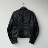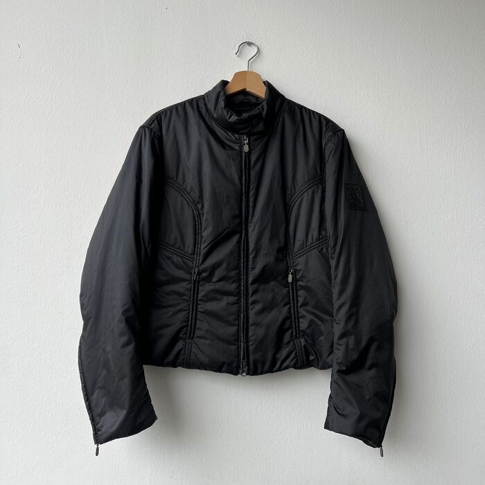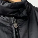 Belstaff, zwarte jas voor dames. Effen zwart, gemaakt van 100% nylon en gewatteerd met 100% polyamide. Ritsen aan de zijkant om de pasvorm te vergroten. Detail twee zijzakken met ritssluiting en sluiting aan de voorkant. Ongeveer maat M.