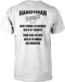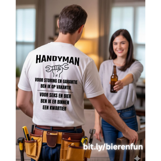 Geef je outfit een flinke dosis humor met deze Handyman-tshirt. Op de achterkant staat de onvergetelijke tekst: “Voor storing en garantie ben ik op vakantie, voor seks en bier ben ik er binnen een kwartier.” Perfect voor iedereen met een knipoog en een goed gevoel voor timing!