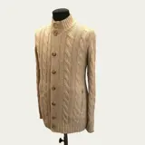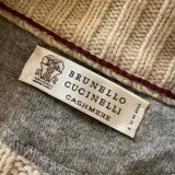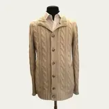 Prachtige Brunello Cucinelli trui made in Italy, nieuw. Vest met volledige knoopsluiting, dubbele kraag, gemaakt van delicaat beige kabelgebreid kasjmier dat consistent en zacht aanvoelt, erg warm. Twee grote zakken met metalen ritsen openen aan de voorkant, de kraag en manchetten zijn afgewerkt met een dunne grijze lijn.