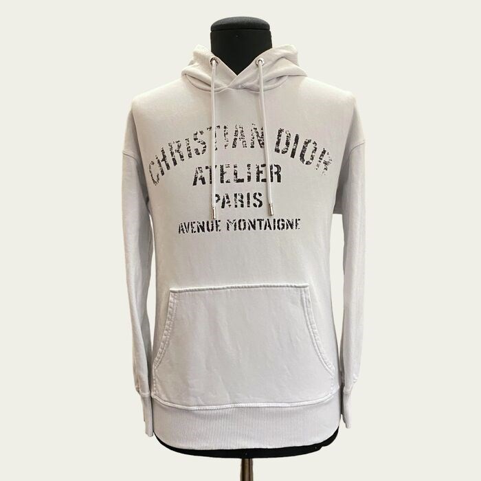Prachtig nieuw sweatshirt van Christian Dior, gemaakt in Italië. Sweatshirt met capuchon van zacht wit katoen met grote centrale zak die aan beide zijden open is. De openhartige kleur van het kledingstuk wordt alleen onderbroken door het zwarte opschrift op de borst, terwijl twee kleine zilveren oogjes met het logo de capuchon verzegelen. Uiteinden van de veters afgewerkt met zilveren buisjes met gegraveerd logo.