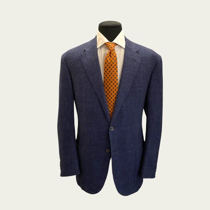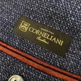 Prachtig nieuw jasje van Corneliani, made in Italy. Jasje met twee knopen van scheerwol Super 120, zeer zacht aanvoelend, waarin draden van verschillende tinten blauw en blauw met elkaar verweven zijn om een aangenaam spel van lichte en donkere tinten lichtjes in reliëf te creëren. Half gevoerd, ongestructureerd, dubbele rugsplit, opgestikte zakken, parelmoer knopen. De onderkraag wordt geaccentueerd door een gedessineerde stof afgewerkt met een leren applicatie, de voering is voorzien van het merklogo. De binnenranden zijn afgewerkt met een bordeauxrood lint, de revers zijn breed.