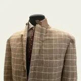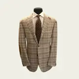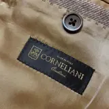 Prachtig nieuw jasje van Corneliani, made in Italy. Jasje met twee geperste drieknopen gemaakt van zachte wol gemengd met angora en cashgora, een kostbare vezel die wordt verkregen door het samenvoegen van twee verschillende polen. Het Prince of Wales-patroon in de tinten beige, bruin en wit wordt verzacht door een dunne lichtblauwe draad, de zakken zijn opgestikt, de knopen in parelmoer. Het is ongevoerd en ongestructureerd en heeft lichtbruine suède elleboogstukken die ook de kraag en revers afwerken met een klein knoopsgat.