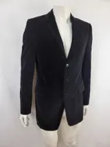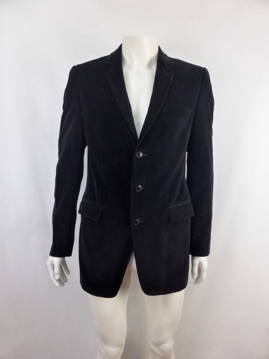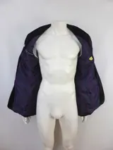 Elegante jas in zwart, met aandacht voor de kleinste details, interieur in stof met paars parelmoereffect, verhoudingen tot op de centimeter nauwkeurig bestudeerd en tijdloos design voor een exclusief herenkledingstuk.